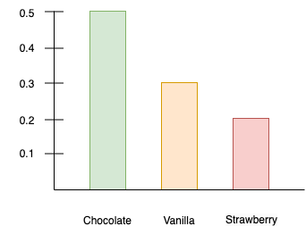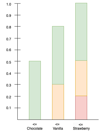 Suppose that we wish to draw random samples from this distribution. One method of doing so involves computing the inverse of the cumulative distribution. The cumulative distribution is depicted in Figure 3. If we impose an arbitrary total ordering on the flavors (e.g. chocolate is first, vanilla is second, strawberry is third, as depicted from left to right in the figure), then the cumulative distribution tells us the probability that a flavor is less than or equal to the respective flavor.