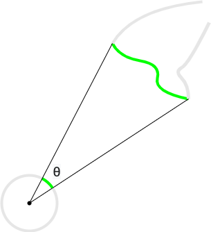 The angle subtended by a segment of a curve is the angle formed between a given vertex and two line segments extending from the vertex to two given points on the curve, as in Figure 1. If the vertex represents the center of a circle, then an arc (segment of the circle) subtends the angle, as is also depicted in Figure 1. As Figure 1 also indicates, such a curve may be a segment of a larger curve. Often, the curve segment is intended to represent the segment that is "visible" from the "vantage point" of the vertex, which is depicted in Figure 1. We may think of this as the measure of the projection of the curve onto an arc of a circle (the measure of the "shadow" cast upon the arc by the curve). Thus, we need to know how to compute this projection for an arbitrary curve.