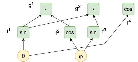 - \(g^2 \rightarrow \theta\). There is only one path: \(g^2 \rightarrow f^1 \rightarrow \theta\). This path is represented by \(\frac{\partial f^1}{\partial \theta}(\theta, \varphi) \cdot \frac{\partial g^2}{\partial y^1}(f(\theta, \varphi)) = \cos \theta \sin \varphi\).