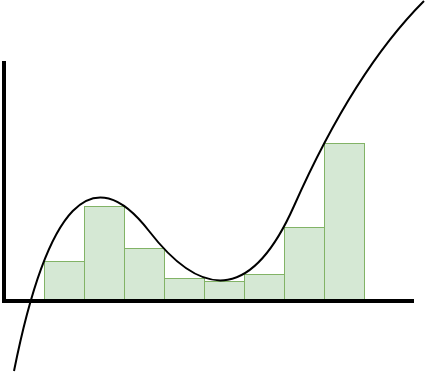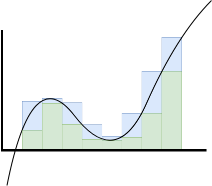 When the greatest lower bound and least upper bound coincide, this represents the value we seek to compute, which we may think of as a weighted sum using \(f\) as a "density" and arbitrarily small volumes, or else as the area under the curve of \(f\).
