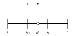 First, we will consider the example of a function \(f : [a, b] \rightarrow \mathbb{R}\) which is non-zero (i.e. equals \(y\) for some \(y \gt 0\)) only at a single point \(x^+\) in its domain:
