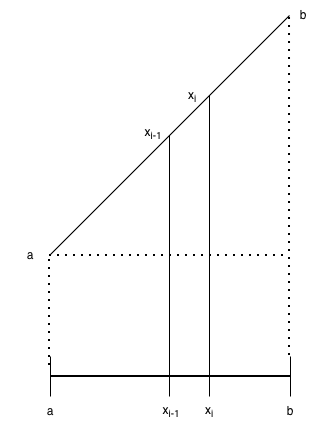 Note that on any interval \([x_{i-1},x_i]\), \(l_i = x_{i-1}\) and \(u_i = x_i\). If we choose a partition \(P\) which partitions \([a,b]\) into \(n\) intervals of equal length \(\frac{b-a}{n}\), then \(x_0 = a\), \(x_1 = a + \frac{b-a}{n}\), \(x_2 = a + 2 \cdot \frac{b-a}{n}\), etc., and in general \(x_i = a + i \cdot \frac{b-a}{n}\).