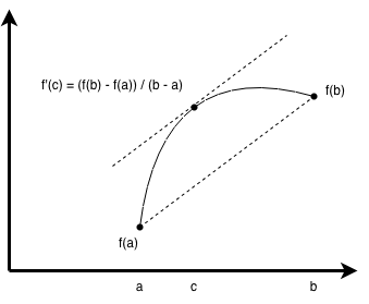 Arithmetically it states, roughly speaking, that, given a function \(f\) differentiable on some interval \((a, b)\), there exists a point \(c \in (a, b)\) such that \(f'(c)\) is the mean of the endpoints \(f(a)\) and \(f(b)\) on this interval, i.e.,