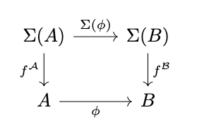 Definition (Homomorphism of Algebras). A homomorphism from a \(\Sigma\)-algebra \(\mathcal{A}\) to a \(\Sigma\)-algebra \(\mathcal{B}\) is a morphism \(\phi : A \rightarrow B\) such that \(\phi \circ f^A = f^B \circ \Sigma(\phi)\), i.e. the following diagram commutes.