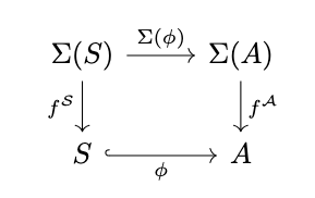 Definition (Subalgebra). A subalgebra of a \(\Sigma\)-algebra \(\mathcal{A}\) is a \(\Sigma\)-algebra \(\mathcal{S}\) which admits a monomorphism \(\phi : \mathcal{S} \hookrightarrow \mathcal{A}\), i.e., the following diagram commutes. A subalgebra is a proper subalgebra if the respective monomorphism is not an isomorphism.