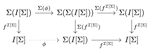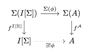 Definition (Initial Algebra). The initial algebra is the initial object \(\mathcal{I}[\Sigma]\) in \(\Sigma\)-Alg, i.e. for any \(\Sigma\)-algebra \(\mathcal{A}\), there exists a unique homomorphism \(\phi : \mathcal{I}[\Sigma] \rightarrow \mathcal{A}\), i.e., the following diagram commutes.