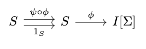 Thus, \(f^{\mathcal{I}[\Sigma]} \circ \phi\) is a homomorphism; however, \(1_{I[\Sigma]}\) is also a homomorphism, so \(f^{\mathcal{I}[\Sigma]} \circ \phi = 1_{I[\Sigma]}\). Likewise: