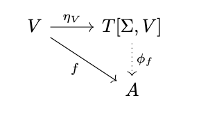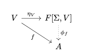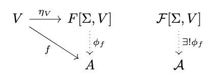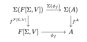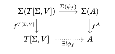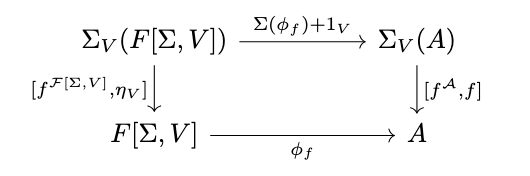 and thus \(\phi_f' \circ f^{\mathcal{F}[\Sigma, V]} = f^{\mathcal{A}} \circ \Sigma(\phi_f')\) and \(\phi_f' \circ \eta_V = f\). Since \(\mathcal{F}[\Sigma, V]\) is a free algebra, \(\phi' = \phi\). Since \([f^{\mathcal{F}[\Sigma, V]}, \eta_V] \circ i_\Sigma = f^{\mathcal{F}[\Sigma, V]}\), it follows that \(\mathcal{F}[\Sigma, V]\) is a term algebra. \(\square\)