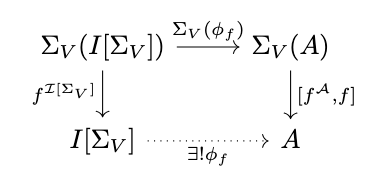 Proof. Define \(\eta_V = f^{\mathcal{I}[\Sigma_V]} \circ i_V\). Let \(f : V \rightarrow A\) be any morphism for some algebra \(\mathcal{A}\). Consider diagram the following diagram in \(\Sigma_V\)-Alg.