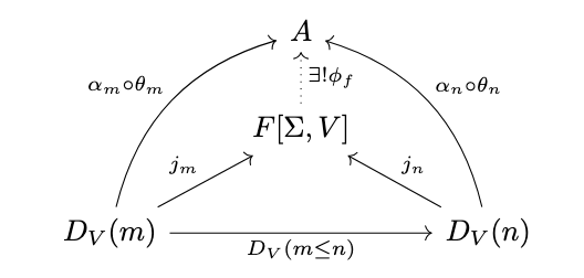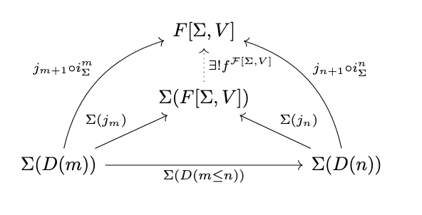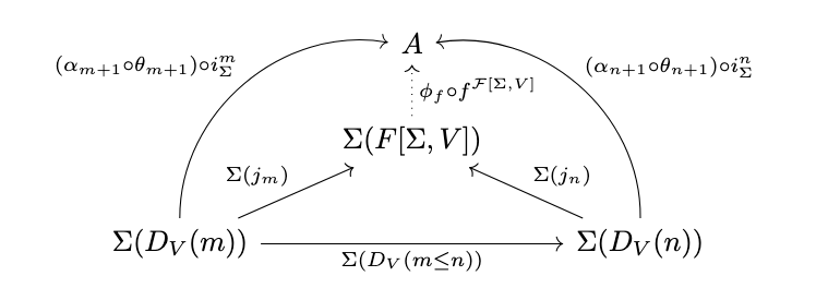 Thus, since \(\Sigma\) preserves directed colimits, the inner triangle commutes and there exists a unique morphism \(f^{\mathcal{F}[\Sigma, V]} : \Sigma(F[\Sigma, V]) \rightarrow F[\Sigma, V]\) that makes the diagram commute. Thus, there exists an algebra with signature \(\Sigma\), carrier \(F[\Sigma, V]\), and operation \(f^{\mathcal{F}[\Sigma, V]}\).