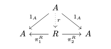 Proof. Since there is a pullback in \(\Sigma\)-Alg, there is likewise a pullback in the underlying category \(\mathbb{C}\). By the definition of a pullback, there exists a (unique) morphism \(r : A \rightarrow K[\phi]\) such that \(\pi^{K[\phi]}_1 \circ r = 1_A\) and \(\pi^{K[\phi]}_2 \circ r = 1_A\) as in the following diagram, thus the kernel is reflexive.
