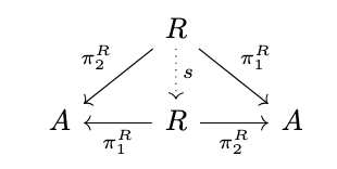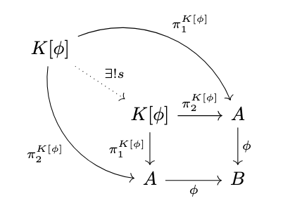 Likewise, there exists a (unique) morphism \(s : K[\phi] \rightarrow K[\phi]\) such that \(\pi^{K[\phi]}_1 \circ s = \pi^{K[\phi]}_2\) and \(\pi^{K[\phi]}_1 \circ s = \pi^{K[\phi]}_2\) as in the following diagram, thus the kernel is symmetric.