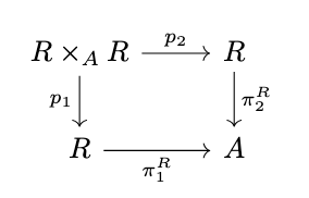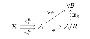 Definition (Quotient Algebra). The quotient algebra \(\mathcal{A}/R\) for a \(\Sigma\)-algebra \(\mathcal{A}\) and congruence \(R\) is the coequalizer of the relational projections in \(\Sigma\)-Alg, i.e., the following diagram commutes. The carrier is denoted \(A/R\) and the operation is denoted \(f^{\mathcal{A}/R}\).