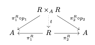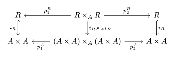 Definition (\(\mathbf{Rel}\) and \(\mathbf{Con}^+\)). For an object \(A\) of an underlying category \(\mathbb{C}\), the category \(\mathbf{Rel}_A\) consists of all relations on \(A\) as objects and inclusions (monomorphisms) as morphisms. The category \(\mathbf{Con}^+_A\) is the full subcategory of \(\mathbf{Rel}_A\) consisting of all fully invariant congruences on \(A\) as objects and inclusions as morphisms.