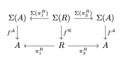 Definition (Algebra). An algebra consists of an endofunctor \(\Sigma\) on a category \(\mathbb{C}\) called the signature, an object \(A\) of \(\mathbb{C}\) called the carrier, and a morphism \(f^A : \Sigma(A) \rightarrow A\) called the operation.