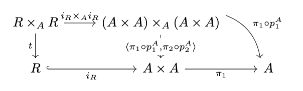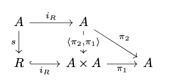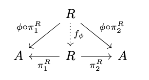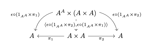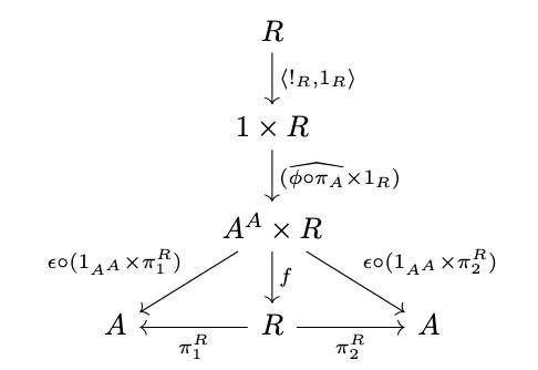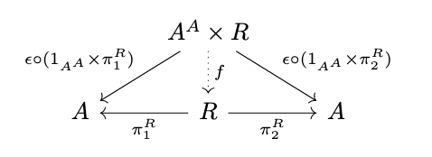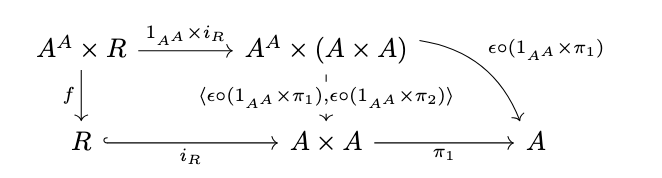 Likewise, \(\pi_2 \circ i_R \circ f = \epsilon \circ (1_{A^A} \times \pi^R_2)\), hence \(i_R \circ f = \langle \epsilon \circ (1_{A^A} \times \pi^R_1), \epsilon \circ (1_{A^A} \times \pi^R_2) \rangle\). Then: