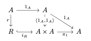 \begin{align*}i_R \circ f &= \langle \epsilon \circ (1_{A^A} \times \pi^R_1), \epsilon \circ (1_{A^A} \times \pi^R_2) \rangle \\&= \langle \epsilon \circ (1_{A^A} \times \pi_1) \circ (1_{A^A} \times i_R), \epsilon \circ (1_{A^A} \times \pi^R_2) \circ (1^{A^A} \times i_R) \rangle \\&= \langle \epsilon \circ (1_{A^A} \times \pi_1), \epsilon \circ (1_{A^A} \times \pi_2) \rangle \circ (1_{A^A} \times i_R)\end{align*}