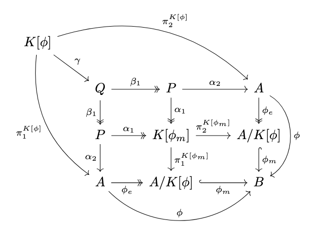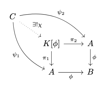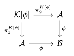 Definition (Kernel of a Homomorphism). The kernel of a homomorphism \(\phi : \mathcal{A} \rightarrow \mathcal{B}\) is the relation \(K[\phi]\) on \(A\) which carries the algebra \(\mathcal{K}[\phi]\) which is the pullback of \(\phi\) along itself as in the following diagram.
