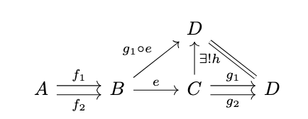 Then, since \(e \circ f_1 = e \circ f_2\) by definition, it follows that \((g_1 \circ e) \circ f_1 = (g_1 \circ e) \circ f_2\). Then, since \(e\) is a coequalizer, it follows that there exists a unique morphism \(h : C \rightarrow D\) such that \(h \circ e = g_1 \circ e\). However, \(g_2\) is a morphism such that \(g_2 \circ e = g_1 \circ e\), and thus, since such a morphism must be unique, it follows that \(g_1 = g_2\). Hence, \(e\) is an epimorphism. \(\square\)
