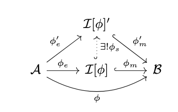 Definition (Image of a Homomorphism). The image of a homomorphism \(\phi : \mathcal{A} \rightarrow \mathcal{B}\) is the smallest subalgebra \(\mathcal{I}[\phi]\) through which \(\phi\) factors, i.e. there exists a homomorphism \(\phi_e : \mathcal{A} \rightarrow \mathcal{I}[\phi]\) and a monomorphism \(\phi_m : \mathcal{I}[\phi] \rightarrow B\) such that \(\phi = \phi_m \circ \phi_e\) and, for any other such subobject \(\mathcal{I}[\phi]'\) and factorization \(\phi_e' : \mathcal{A} \rightarrow \mathcal{I}[\phi]'\) and \(\phi_m : \mathcal{I}[\phi]' \rightarrow \mathcal{B}\), \(\mathcal{I}[\phi]\) is a subalgebra of \(\mathcal{I}[\phi]'\) as in the following diagram.