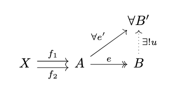 Definition (Regular Epimorphism). A regular epimorphism is an epimorphism \(e : A \rightarrow B\) in a category \(\mathbb{C}\) which is a coequalizer of \textit{some} pair of parallel morphisms, as in the following diagram.