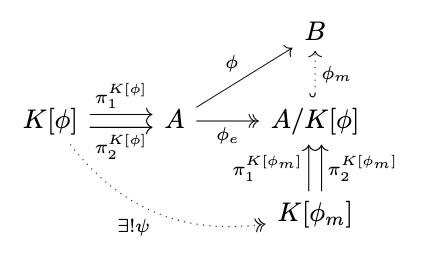 Theorem (Homomorphism Theorem). For any regular epimorphism \(\phi: \mathcal{A} \rightarrow \mathcal{B}\) of \(\Sigma\)-algebras with an underlying regular category \(\mathbb{C}\), \(\mathcal{B} \cong \mathcal{A}/K[\phi]\).
