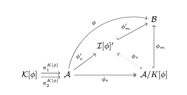 Theorem (Canonical Image Theorem). For any homomorphism \(\phi : \mathcal{A} \rightarrow \mathcal{B}\) with an underlying category \(\mathbb{C}\) which is a regular category, the quotient algebra \(\mathcal{A}/K[\phi]\) is the image of \(\phi\).