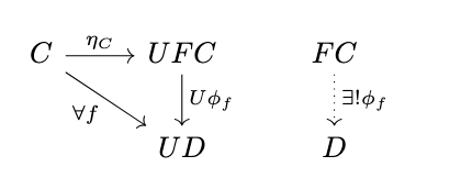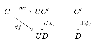 Definition (Completion). For a category \(\mathbb{C}\) and a full subcategory \(\mathbb{D}\) with inclusion functor \(U : \mathbb{D} \rightarrow \mathbb{C}\), the completion of an object \(C\) of \(\mathbb{C}\) is the free object with respect to the functor \(U\), as in the following diagram;