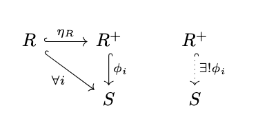 In detail, the completion, if it exists, is the fully invariant congruence \(R^+\) such that there exists an inclusion \(\eta_R : R \hookrightarrow R^+\) such that, for any inclusion \(i : R \hookrightarrow S\), there exists a unique inclusion \(\phi_i : R^+ \hookrightarrow S\) such that \(\phi_i \circ \eta_R = i\). If there exists a completion for each relation \(R\), then \(U\) has a left adjoint \(F : \mathbf{Rel}_A \rightarrow \mathbf{Con}^+_A\) with \(F(R) = R^+\) and \(F(i : R \hookrightarrow S) = i\). Thus, a fully invariant completion of a relation \(R\) is also the least fully invariant congruence containing \(R\) in the sense that \(R\) is the least subobject of \(R^+\).