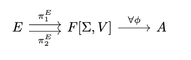 Definition (Model, Satisfaction). A relation of identities \(E\) on \(F[\Sigma, V]\) is satisfied (or holds) in an algebra \(\mathcal{A}\) (written \(\mathcal{A} \models E\)) if, for every homomorphism \(\phi : \mathcal{F}[\Sigma, V] \rightarrow \mathcal{A}\), \(\phi \circ \pi^E_1 = \phi \circ \pi^E_2\), i.e., the following diagram commutes. The algebra \(\mathcal{A}\) is called a model of \(E\).